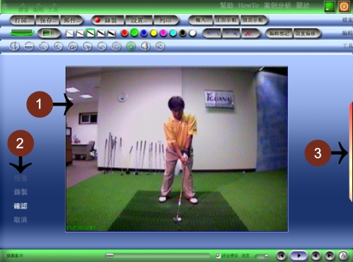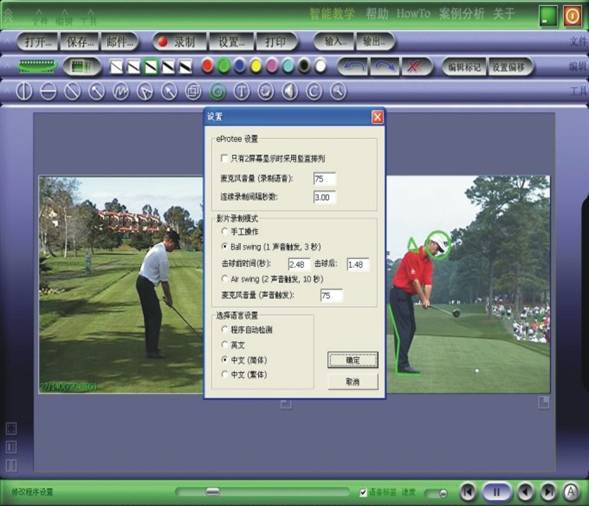 支持三種語言,可自由切換簡\繁\英等三種語言.支持聲控自動錄制。當擊球前的2.48秒和擊球后的1.48秒系統(tǒng)會自動錄制,然后自動播放一次后又自動進行錄制!整個過程由擊球場自動控制,使用非常方便。同時它還支持手動錄制,結合DV還可實現(xiàn)離線拍攝功能。先用DV將教練打球的動作錄制下來,回家后打開DV將其調(diào)成播放狀態(tài),在DV的顯視屏可以看到打球動作。然后打開高爾夫軟件就可以看到影像跟DV的同步播放。只需要在擊球前按錄制,收桿后按完成即可轉換成swing格試的文件。